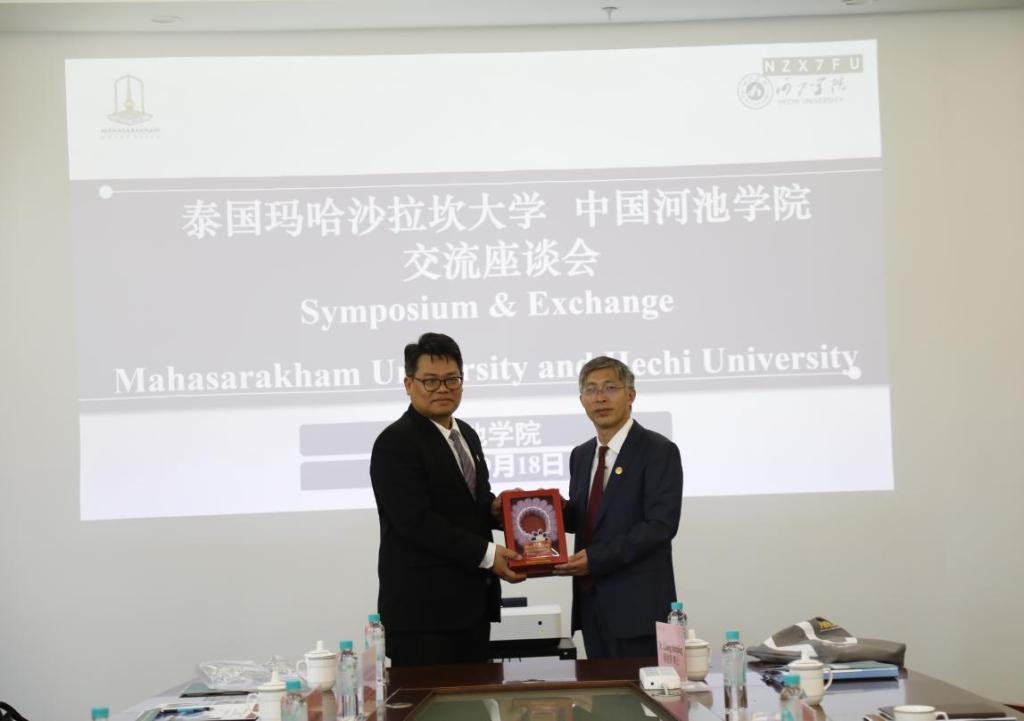 From September 17 to 19, a delegation from Mahasarakham University of Thailand visited our university for a three-day industrial cooperation exchange. The delegation, led by President Prayook Srivilai, was received by Ma Shaojian—Deputy Secretary of the University Party Committee and President of Hechi University—in Conference Room 1507 of Zhiyuan Building. Vice Presidents Qin Yongling and He Weiguo also presented at the meeting.